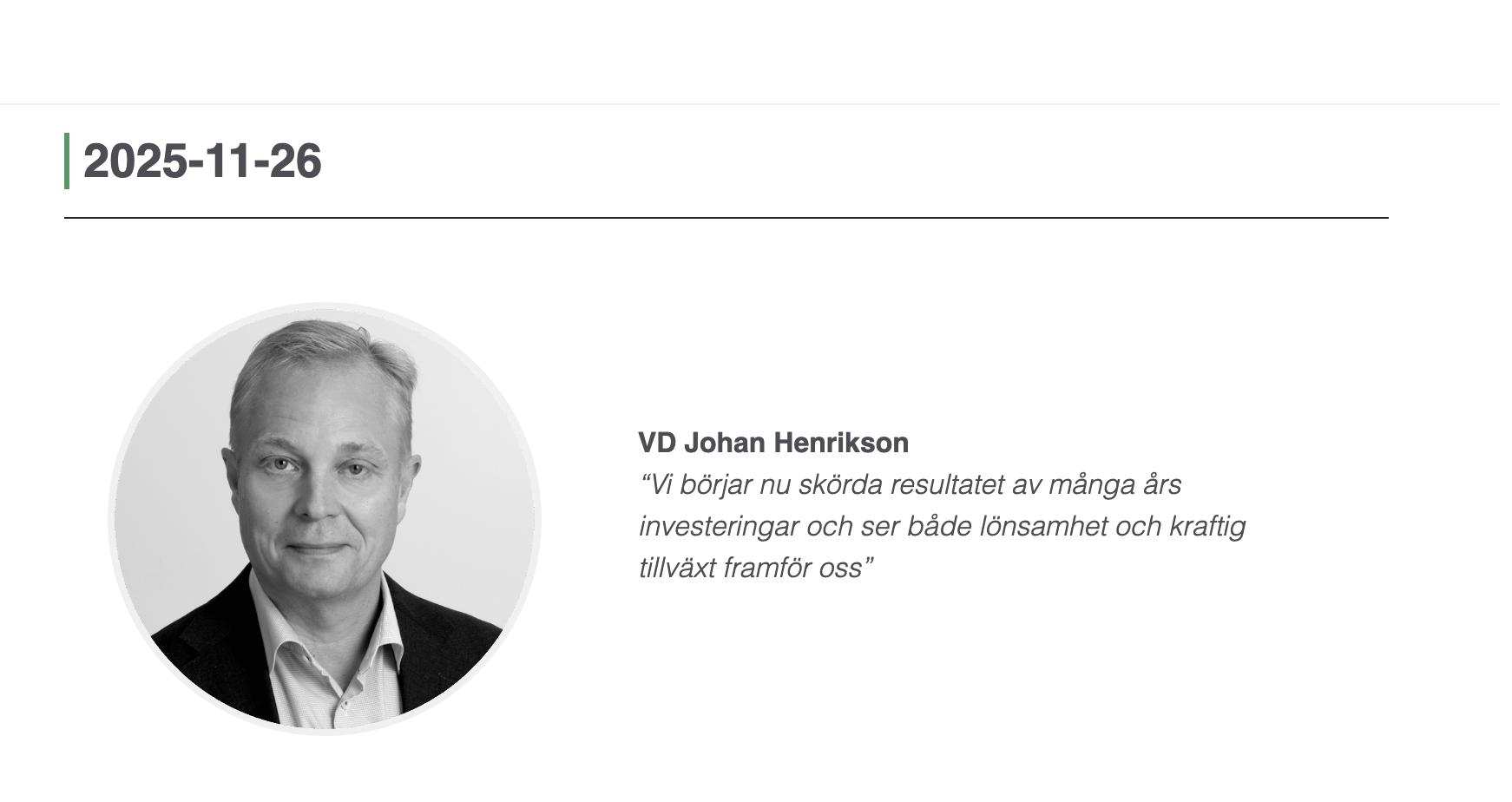 Den 26 november 2026 publicerade Analyst Group en intervju med Frejas vd Johan Henrikson. Artikeln når du via denna länk.