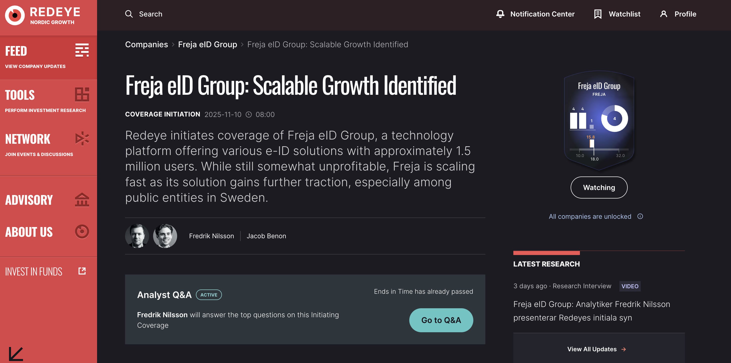 För mer information, forum, analytikervideo och annat material om Freja på Redeyes hemsida, vänligen klicka på denna länk.